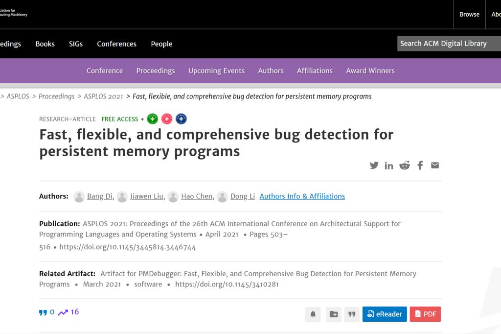 2021/04/25信科院课题组在持久性内存储存研究方面获得新进展近日,信息科学与工程学院陈浩教授课题组在持久内存研究领域取得新进展,博士生狄棒的论文“Fast, Flexible, and Comprehensive Bug Detection for Persistent Memory Programs”在计算机系统领域顶级国际会议ACM...