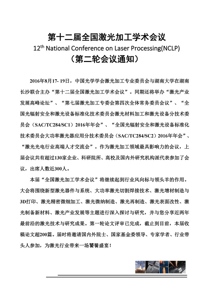2016/07/11第十二届全国激光加工学术会议第十二届全国激光加工学术会议通知(第二轮).pdf c6dbd7f68099a7684564ab0c454f84bf.pdf (413.23 KB)