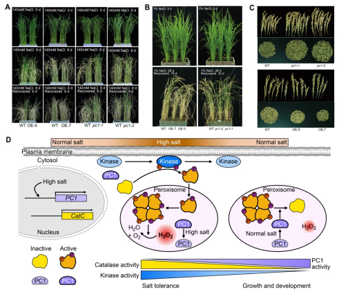 2023/06/25生物学院刘选明/林建中团队发现磷酸酶PC1是平衡水稻耐盐和生长发育的分子开关近日,生物学院刘选明/林建中团队从水稻中发现了一个调控耐盐性的蛋白质磷酸酶PC1(Phosphatase ofCatalase1),提出了PC1作为CAT响应盐胁迫的分子开关参与平衡水稻耐盐和正常生长发育的新机制。该研究成果为解析...
