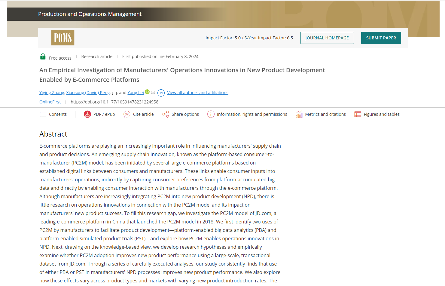 2024/02/23工管院张逸颖研究成果在国际管理学顶刊发表近日,工商管理学院信息管理与电子商务系助理教授张逸颖在供应链管理领域研究取得新突破,研究成果以“An Empirical Investigation of Manufacturers’ Operations Innovations in New Product Development Enabl...