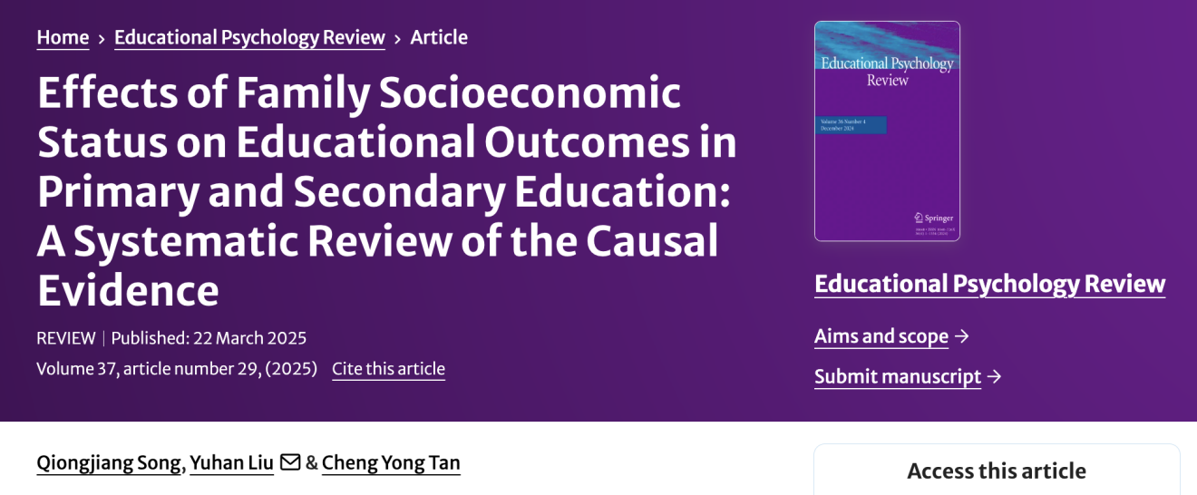2025/04/08教科院宋琼将老师研究成果在《Educational Psychology Review》发表近日,教科院宋琼将老师与香港大学教育学院研究团队在教育平等政策研究领域取得进展。研究成果以《Effects of Family Socioeconomic Status on Educational Outcomes in Primary and Secondary Education: A Syst...