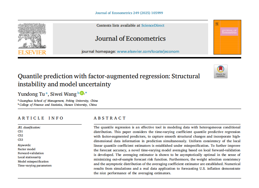 2025/04/10金统院汪思韦助理教授研究成果在计量经济学顶刊发表近日,金融与统计学院汪思韦助理教授在计量经济学领域取得研究进展,研究成果以“Quantile prediction with factor-augmented regression: Structural instability and model uncertainty”为题在计量经济学国际...